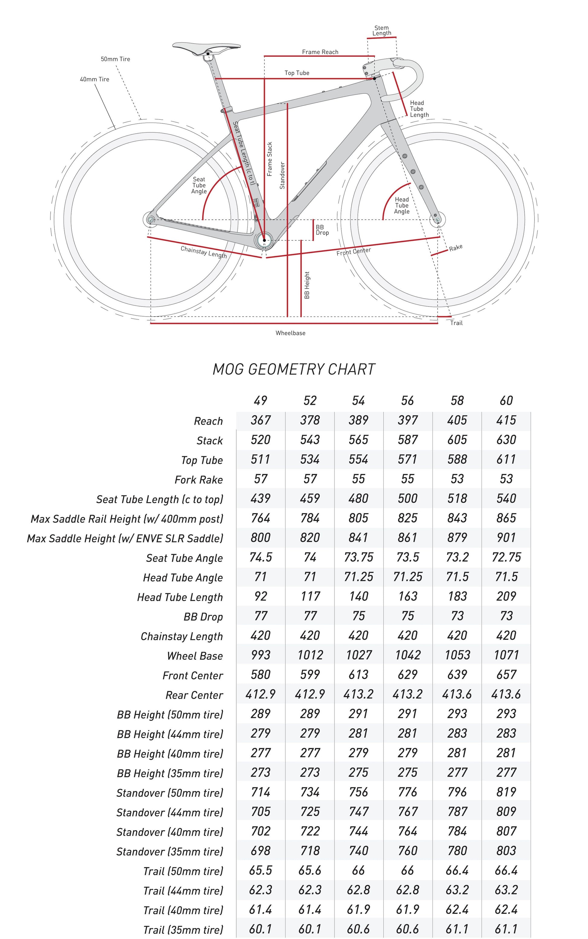 | Frame Size/Fork Rake | 49cm/57, 52cm/57, 54cm/55, 56cm/55, 58cm/53, 60cm/53 |