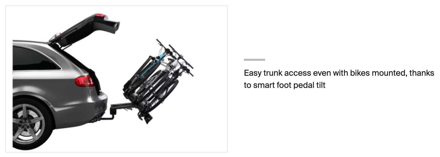 Thule VeloCompact is a compact and lightweight bike carrier for everyday use, carrying up to four bikes. It is the ideal choice for a range of bike styles, including road bikes, ebikes or mountain bikes. Even when the bikes are loaded you still have access to the trunk. Also, with the Thule VeloCompact 4th Bike Adapter (sold separately) the bike rack can be extended to carry 4 bikes. This compact everyday bike rack can also be folded and becomes small enough to store in the trunk of most cars.