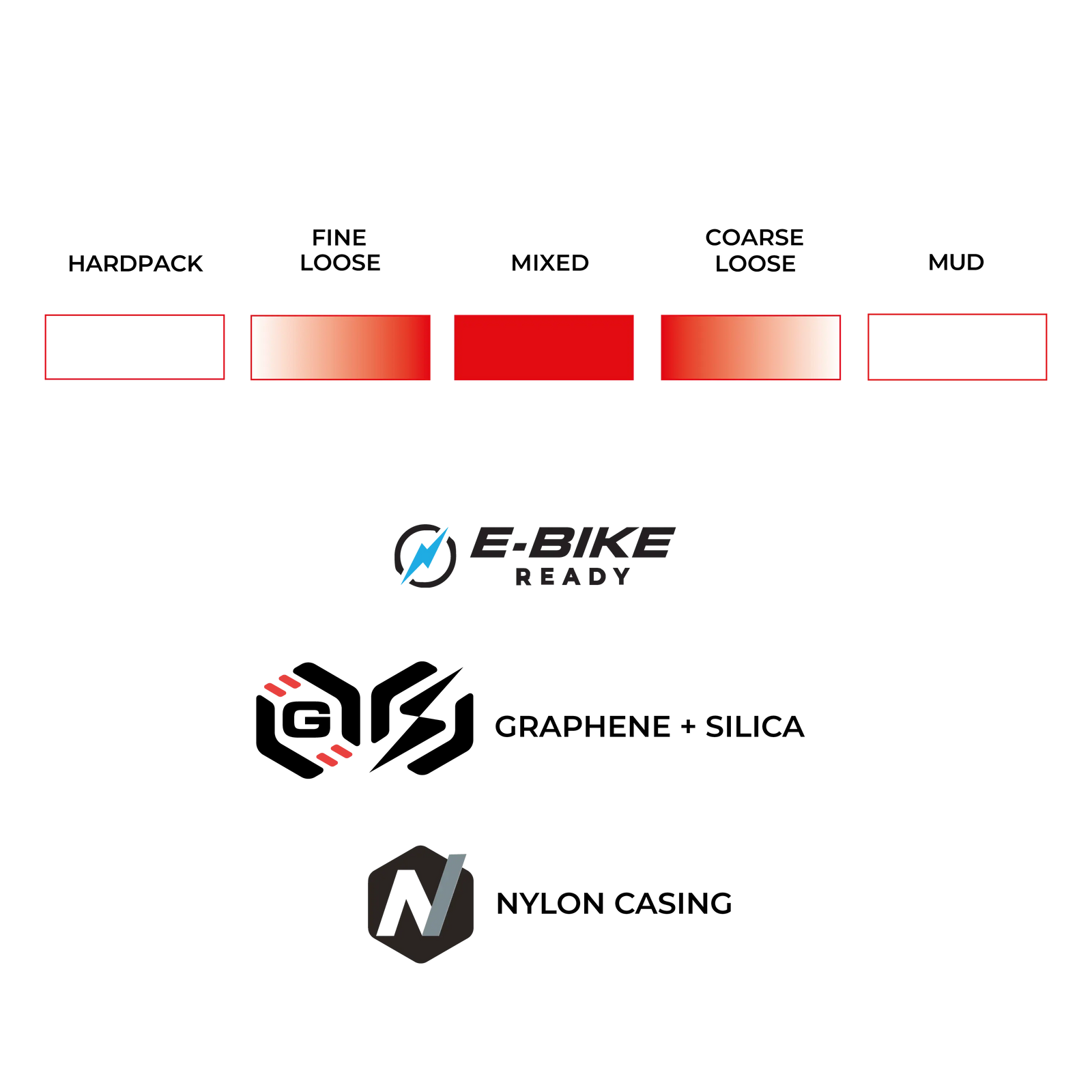Underneath it all, the advanced Graphene + Silica Race Formulation strikes a perfect harmony between grip, speed, and long-wearing durability — tailored for riders who attack every section of the course.